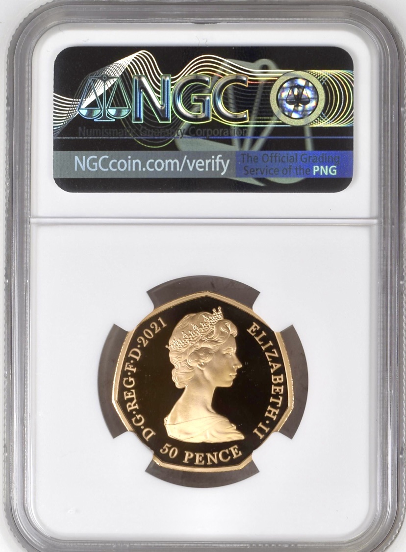 Fifth crowned portrait of Queen Elizabeth II by Jody Clark. Running continuously around the effigy: ‘ELIZABETH II · D · G · REG · F· D · 50 PENCE · 2021’.
