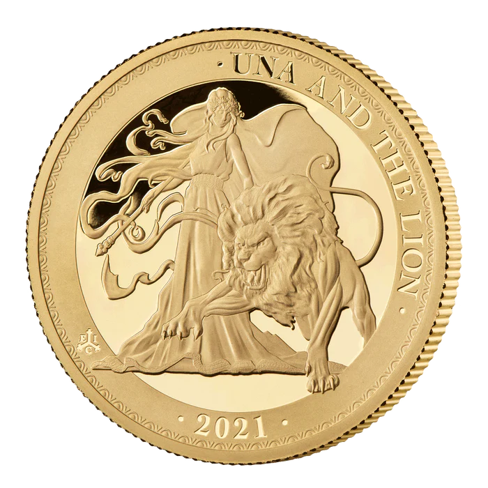 Celebrating our heroine Una, an iconic symbol of beauty and honour, and her majestic protector – the lion, the 2021 Una and the Lion 1oz Gold Proof coin features a beautiful new design by engraver Glyn Davies. The 2021 powerful and dramatic design highlights the beauty of Una and the raw power of the lion.