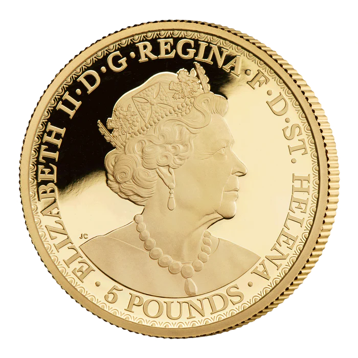 Around the effigy is the monarch’s legend and the date: ELIZABETH II · D · G · REGINA · F · D · ST. HELENA · 5 POUNDS ·. Translated from Latin: Elizabeth the Second, by the Grace of God, Queen, Defender of the Faith, Saint Helena.